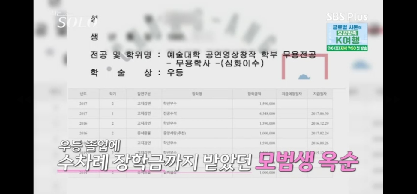 중앙대학교에서 현대 무용을 전공했고, 우등 졸업에 수차례 장학금을 받았던 모범생으로 자랑을 했어요.